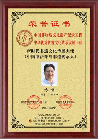 新时代非遗文化传播大使、中国书法篆刻非遗传承人