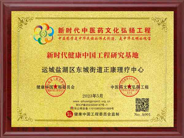 运城盐湖区东城街道正康理疗中心是健康中国工程委员会和中医药文化弘扬工程联合认证的新时代健康中国工程研究基地,是健康中国工程委员会和中医药科普行动办公室联合认证的新时代中医药健康文化科普宣传示范基地。