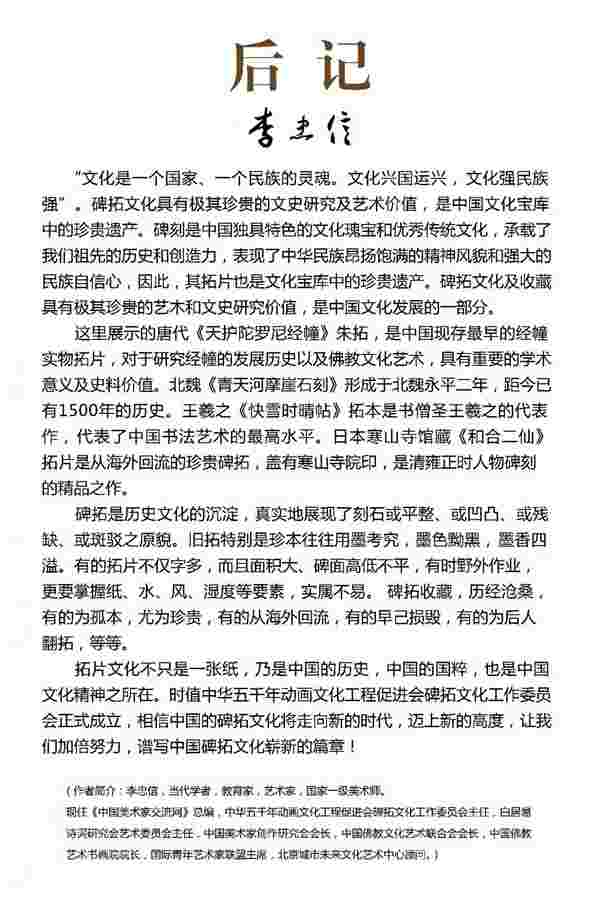 拓片文化是中国文化发展的一部分。“文化是一个国家、一个民族的灵魂。文化兴国运兴,文化强民族强”,让我们坚定文化自信,坚定以“中国文化”造就人类福祉,为民族谋复兴,为世界谋大同。